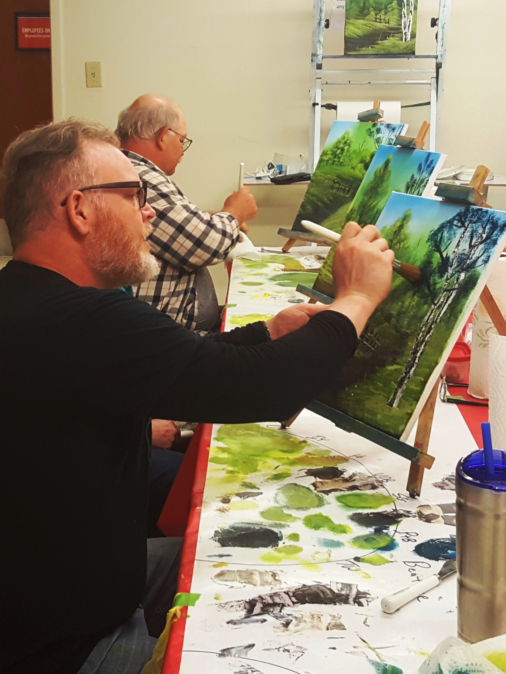 Teresas easel brings us this wet on wet painting classlearn to use a pallet knife on this beautiful mountain design by Steve Ross. In this picture they are holding a painting that I own from the early 1990s. Ironically thanks to Bob Ross Inc all this time Ross was bigger than ever which helped class sizes.